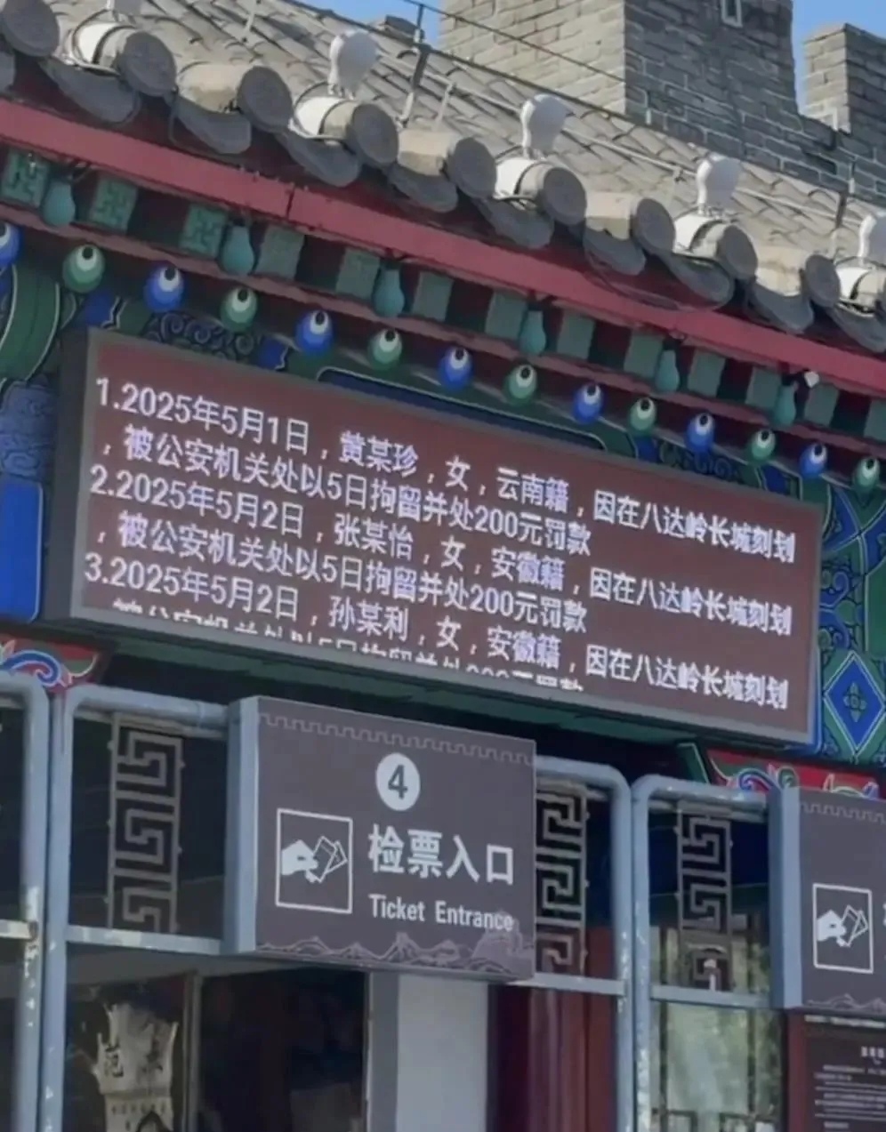 收到相关举报后,八达岭长城景区工作人员表示,景区多个出入口都设置了禁止刻划的警示提醒,安检处还会公示以往有刻划等不文明行为的游客姓名,广播也会反复进行相关提醒。记者也注意到,景区的这番说法其实在今年8月份就有所体现。当时,景区电子大屏滚动播放5月份在长城上刻划游客的相关信息,这些游客都被公安机关处以5日拘留并罚款200元的处罚。而针对24日的这起刻字行为,警方已经立案,会依照相关规定依法处理。