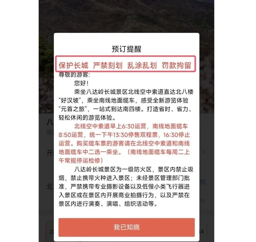 记者也注意到,现在在线上买八达岭长城门票,会弹出“保护长城 严禁刻划 乱涂乱划 罚款拘留”的十六字红色警示!“长城的每一块砖都承载着历史价值,都想着去刻划留念,无视文物保护规定,长城将伤痕累累。”有网友表示。