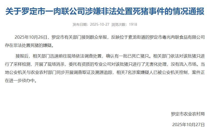 10月27日晚,罗定市农业农村局针对此事发布情况通报称,10月26日,罗定市有关部门接到群众举报,反映位于素龙街道的罗定市粤光肉联食品有限公司存在非法处置死猪的嫌疑。接报后,相关部门迅速前往现场依法调查处置,确认有一批已死亡猪只。相关部门依法对该批猪只进行了采样检测,开展了现场消杀,委托有资质的专业公司对该批猪只进行了无害化处理,没有流入市场。当地公安机关与农业农村部门同步开展调查取证及溯源追踪,相关7名涉案嫌疑人已被公安机关控制,案件正在进一步侦办中。