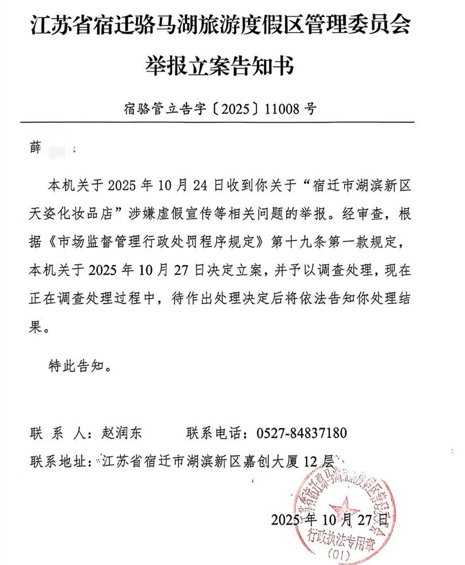 10月28日,记者联系上湖滨新区综合执法局,对方表示已于10月27日对被举报人涉嫌虚假宣传的违法行为进行立案调查。工作人员表示,10月24日接到关于天姿美容店涉嫌虚假宣传等相关问题的举报后,立即向消费者收集相关证据。10月27日被举报人接受询问调查,根据《市场监督管理行政处罚程序规定》第十九条相关规定,执法局于当日对被举报人涉嫌虚假宣传的违法行为进行立案调查,现在案件正在调查处理过程中,将在法定期限内作出处理结果。