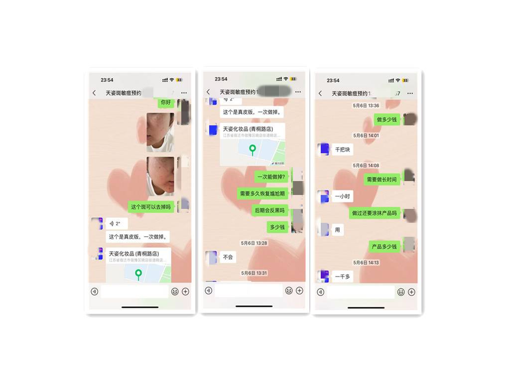 薛女士表示,今年5月,她通过网络了解到宿迁湖滨新区天姿化妆品店,随后添加店家微信沟通。店家在微信聊天中承诺“一次去掉真皮斑,不会反复”,并给出价格大概在2000多元。6月22日,薛女士前往该店进行第一次激光祛斑治疗,“当天实际消费3830元,其中技术费980元,产品费2850元。”