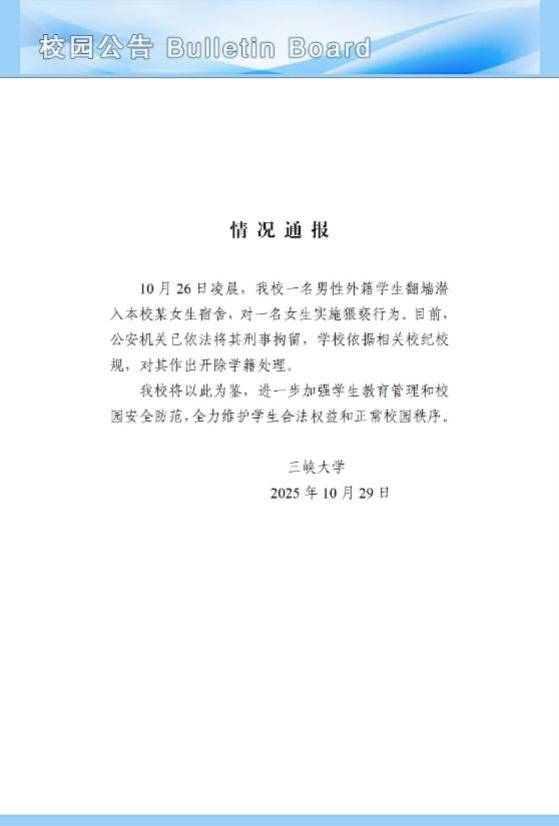 三峡大学通报:“爬楼夜闯女生宿舍”留学生被刑事拘留并开除学籍
