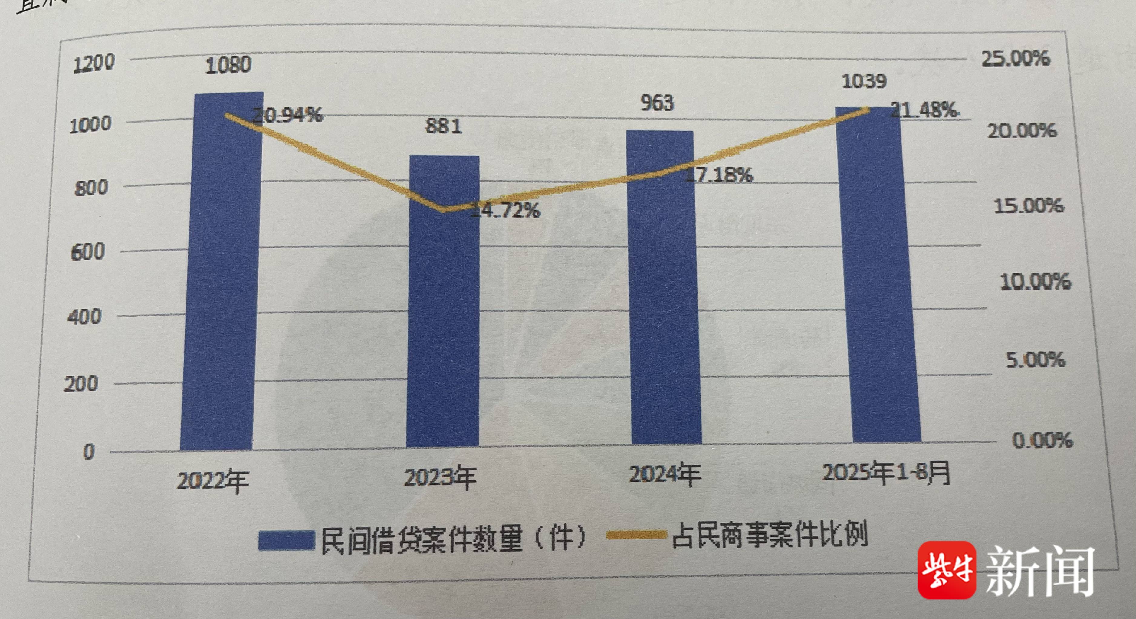 近三年来,民间借贷案件一直是高淳法院受理民商事案件中数量最多的案由之一,且案件数量、涉案金额从2023年逐年快速持续增长。2025年1-8月,该院已受理民间借贷案件1039件,占同期民商事案件比例21.48%,涉案金额约为5.11亿元。