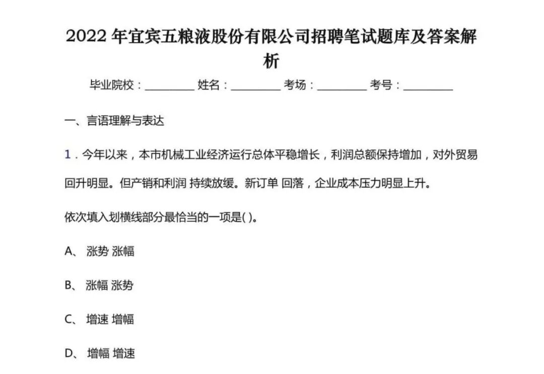 在试题方面,商家所发的文件细化到人力资源、市场营销、生产技术员等各岗位的笔试题,其中同样有些与五粮液相关,如“五粮液的核心卖点是什么?”“五粮液的品牌价值是什么?”,其余试题则五花八门,包括逻辑题、文史常识、数学推理等各方面内容。