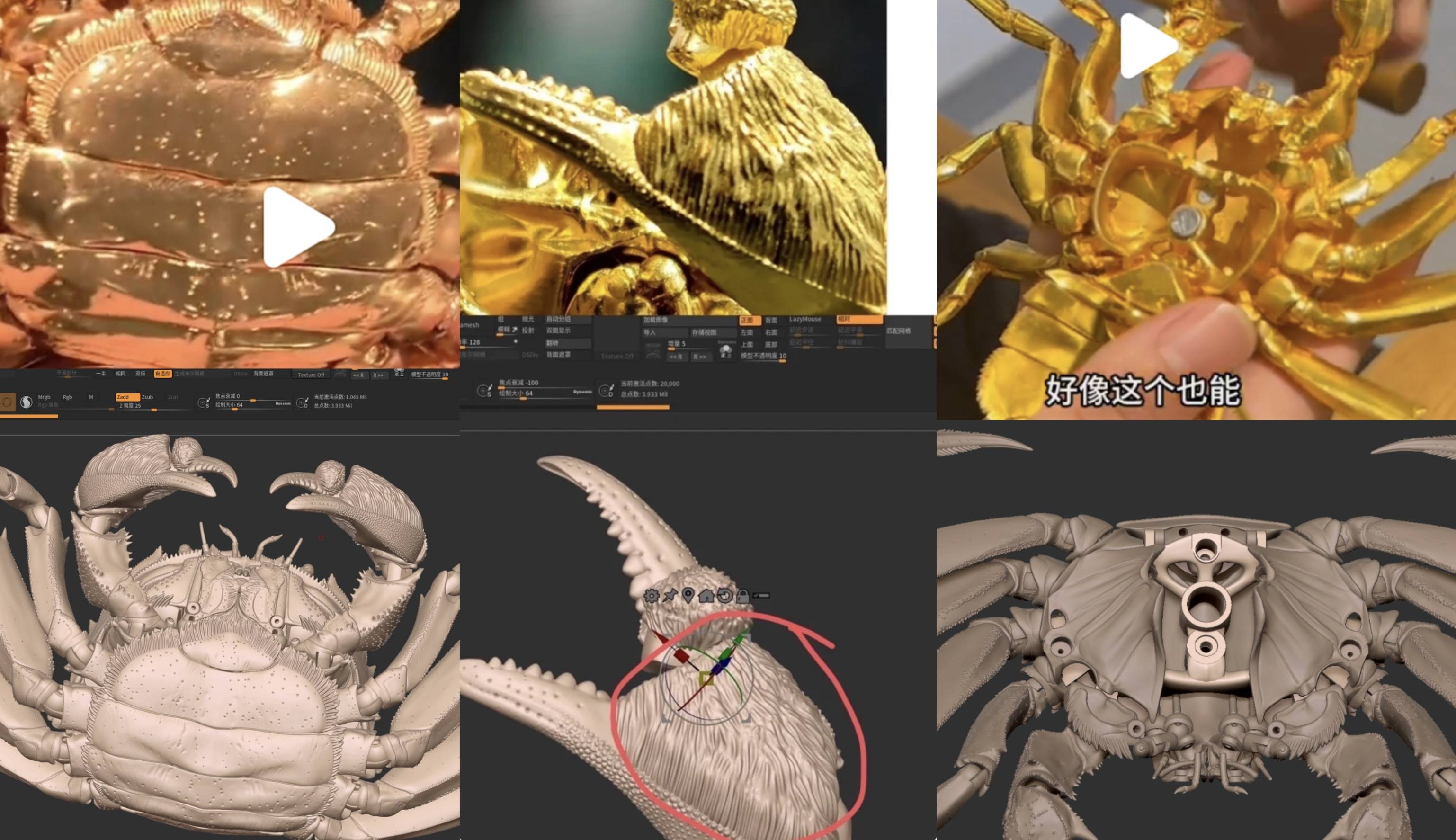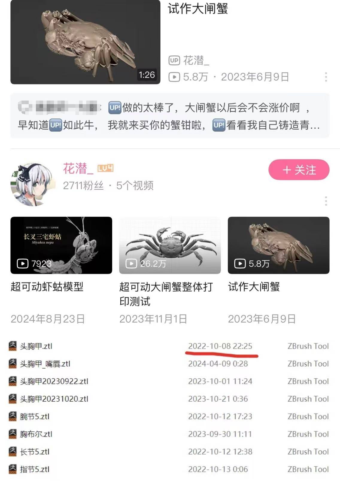 “君卿工作室”设计师二六告诉记者,相关帖文中提到的螃蟹模型,是其参与设计制作的“中华绒鳌蟹模型”,最早由工作室另一名设计师“花潜”发起,其个人主页留存有模型展示的记录。“我们的制作流程大致是购买螃蟹进行研究拆解,然后在电脑上进行模型制作,之后再交给3D打印部门进行测试,测试通过后就会发售。”二六表示,工作室正式开始在售卖该模型是在2024年初,设计师“花潜”最早公开的展示视频时间是在2023年6月9日,“一些建模文件的日期更早,比如有部分结构在2022年10月就已经有记录”。