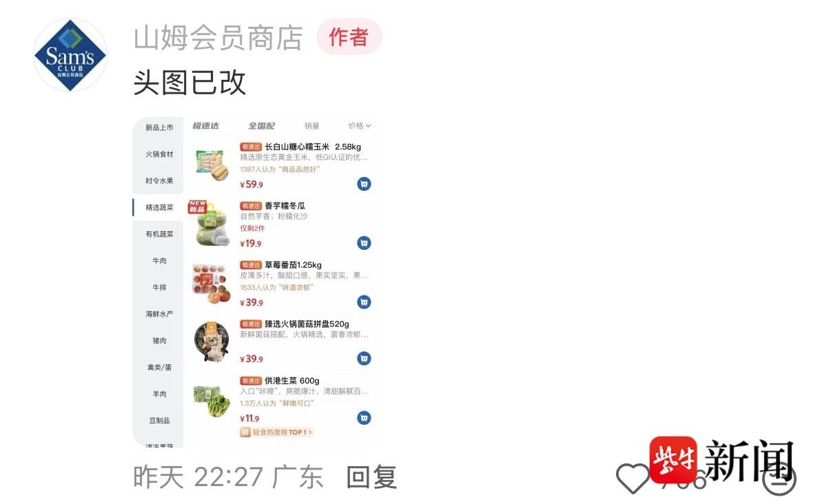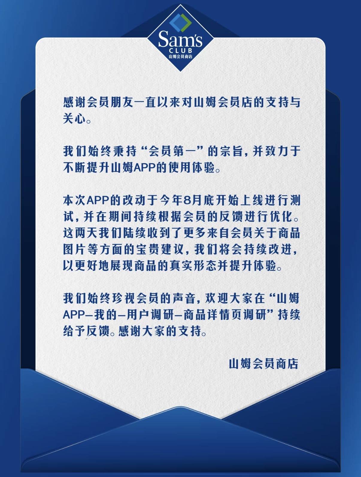 “本次APP的改动于今年8月底开始上线进行测试,并在期间持续根据会员的反馈进行优化。这两天我们陆续收到了更多来自会员关于商品图片等方面的宝贵建议,我们将会持续改进,以更好地展现商品的真实形态并提升体验。我们始终珍视会员的声音,欢迎大家在‘山姆APP-我的-用户调研-商品详情页调研’持续给予反馈。感谢大家的支持。”除此之外,山姆还在评论区配图称:“头图已改。”