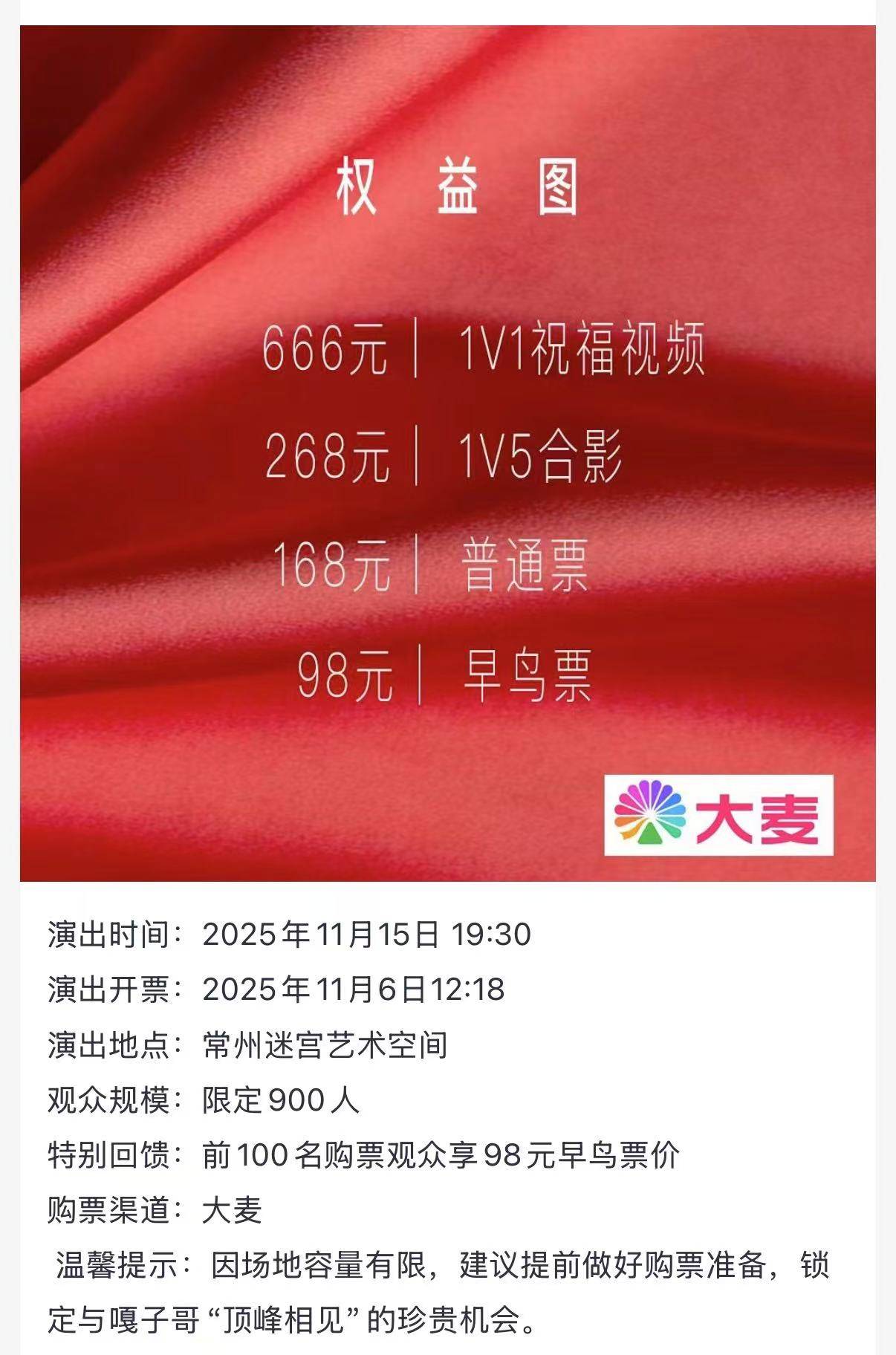 据该票务平台详情内容,“嘎子明星喜乐会”原定于11月15日晚进行演出,票价有98元、168元、268元和666元四个档位,观众规模限定900人。其中,268元可以获得1V5合影,666元可以获得1V1祝福视频。