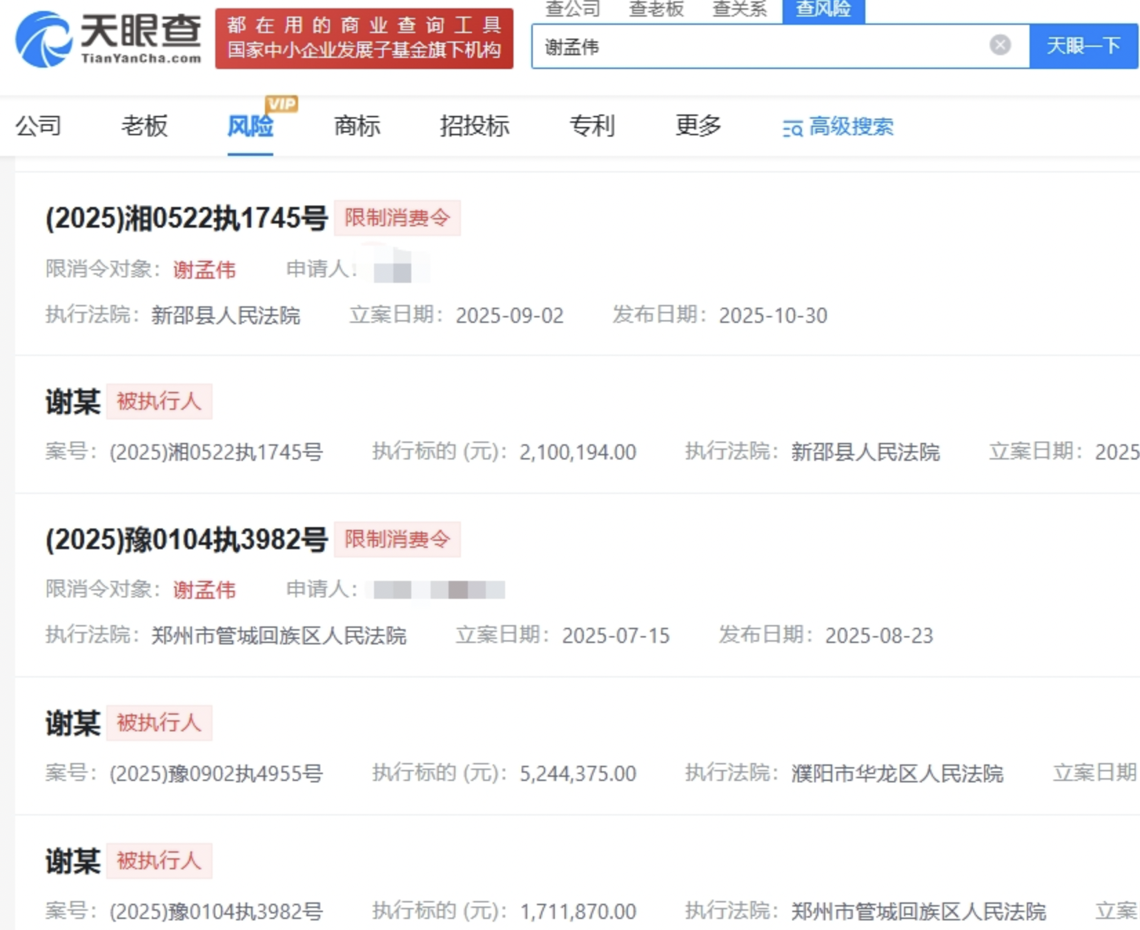 值得注意的是,此前,谢孟伟曾因民间借贷纠纷被河南省郑州市管城回族区人民法院执行171万余元,并被限制高消费。