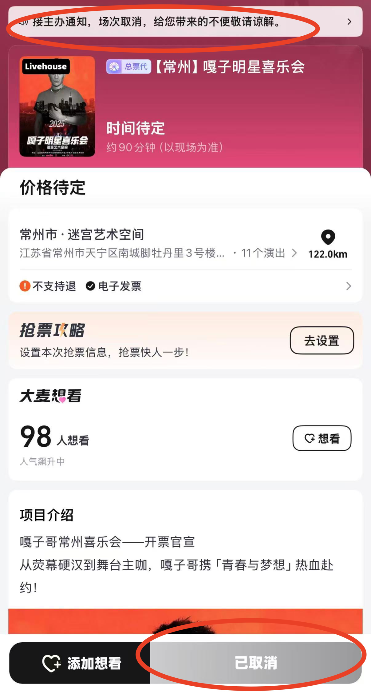 据扬子晚报/紫牛新闻此前报道,有网友称“嘎子”谢孟伟将举办“嘎子明星喜乐会”。11月4日,记者在相关票务APP上看到,平台发布公告称该演出“嘎子明星喜乐会”已经取消:“接主办通知,场次取消,给您带来的不便敬请谅解。”