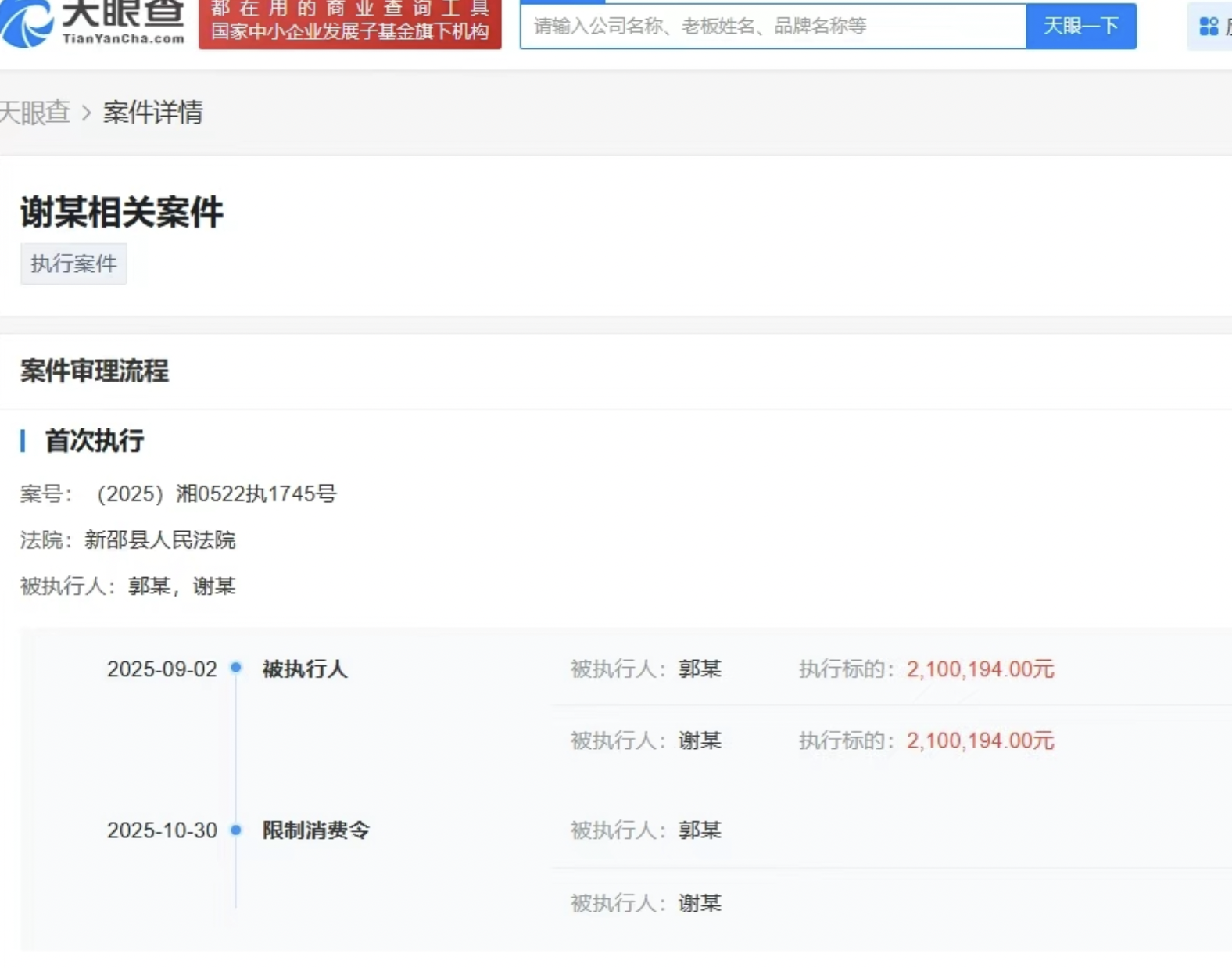 11月4日,扬子晚报/紫牛新闻记者从天眼查获悉,近日,因未按指定期间履行生效法律文书确定的给付义务,谢孟伟(“嘎子哥”)及郭珊珊(“嘎子哥”妻子)被限制高消费,涉及民间借贷纠纷案件,执行法院为新邵县人民法院。案件流程信息显示,今年9月,二人已因此案被执行210万余元。