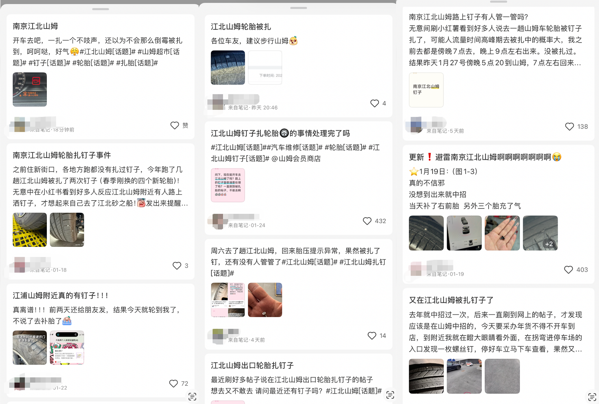 记者调查发现,黄女士的遭遇并非孤例。记者在社交平台上搜索“南京江北山姆钉子”,发现近一个月内相关的帖子达数十条。记者注意到,这些帖子中车主反映被扎胎的位置集中在江北山姆停车场入口、出口及周边道路,有网友吐槽“开车去吧,一扎一个不吱声”,还有网友分享自己在附近踩到钉子扎进自己的鞋底,该网友感叹:“扎到车都是其次了,现在想想后怕,还好没扎到人。”