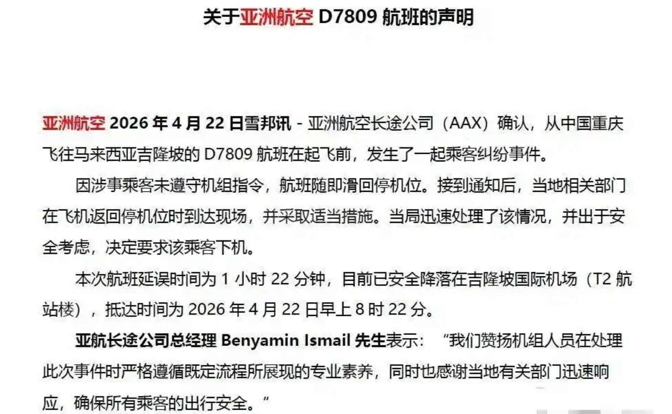 随后,亚洲航空发布声明:因涉事乘客未遵守机组指令,航班随即滑回停机位。接到通知后,当地相关部门在飞机返回停机位时到达现场,并采取适当措施。当局迅速处理了该情况,并出于安全考虑,决定要求该乘客下机。本次航班延误时间为1小时22分钟,目前已安全降落在吉隆坡国际机场(T2航站楼),抵达时间为2026年4月22日早上8时22分。