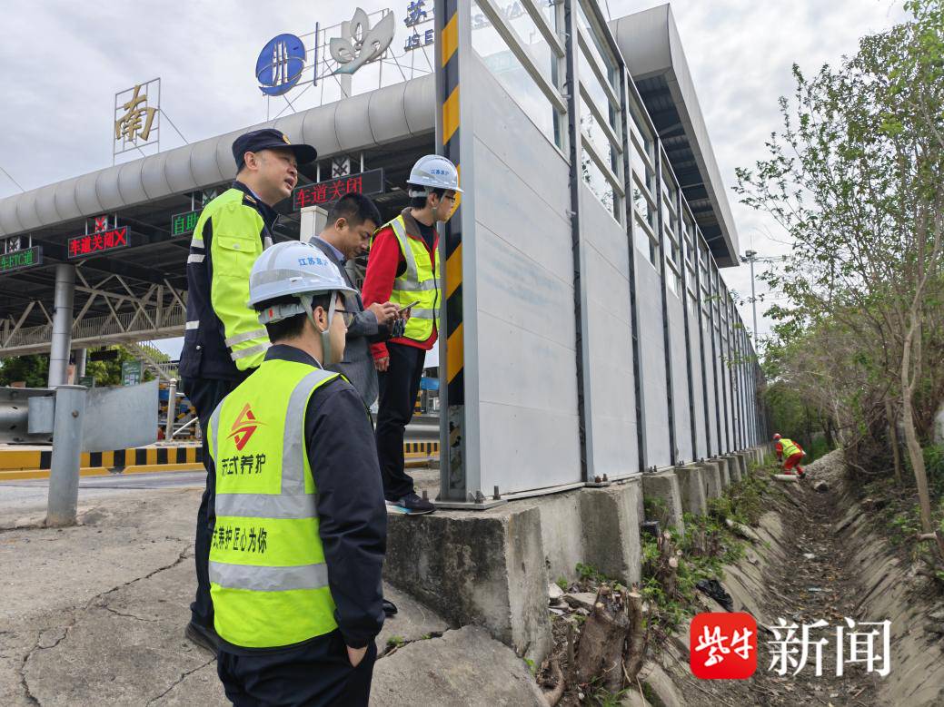 在G40江都南收费站声屏障外侧,检查组发现一处护网被人为打开,公路用地内排水沟堵塞。检查组当场向养护部门下达指令,要求立即修复护网、清淤排水沟,确保设施无死角、无隐患,从源头筑牢节日安全防线。