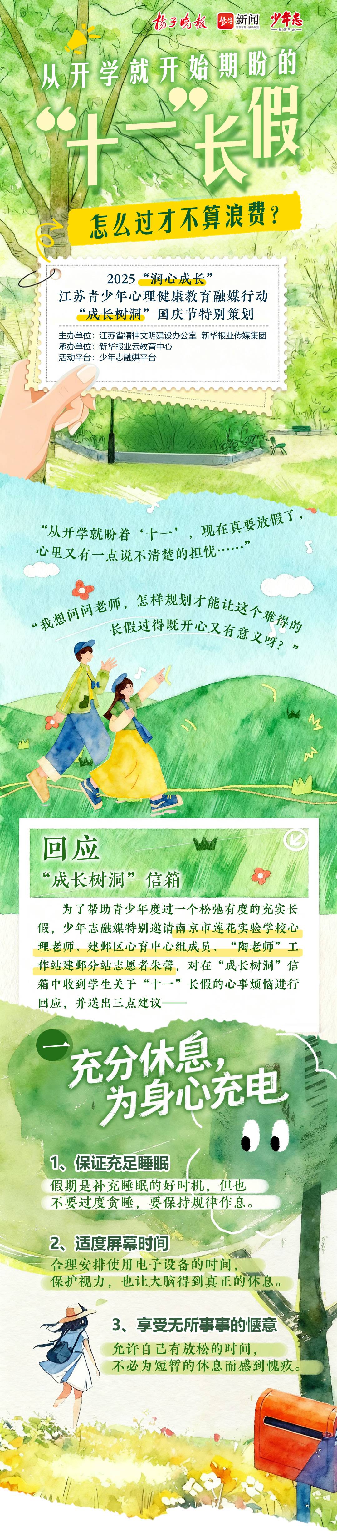 “从开学就盼着‘十一’,现在真要放假了,心里又有一点说不清楚的担忧……”“我想问问老师,怎样规划才能让这个难得的长假过得既开心又有意义呀?”为了帮助青少年度过一个松弛有度的充实长假,作为“成长树洞”漂流计划特邀的“成长导师”,南京市莲花实验学校心理老师、建邺区心育中心组成员、“陶老师”工作站建邺分站志愿者朱蕾,对在“成长树洞”信箱中收到学生关于“十一”长假的心事烦恼进行回应,并送出长假建议——