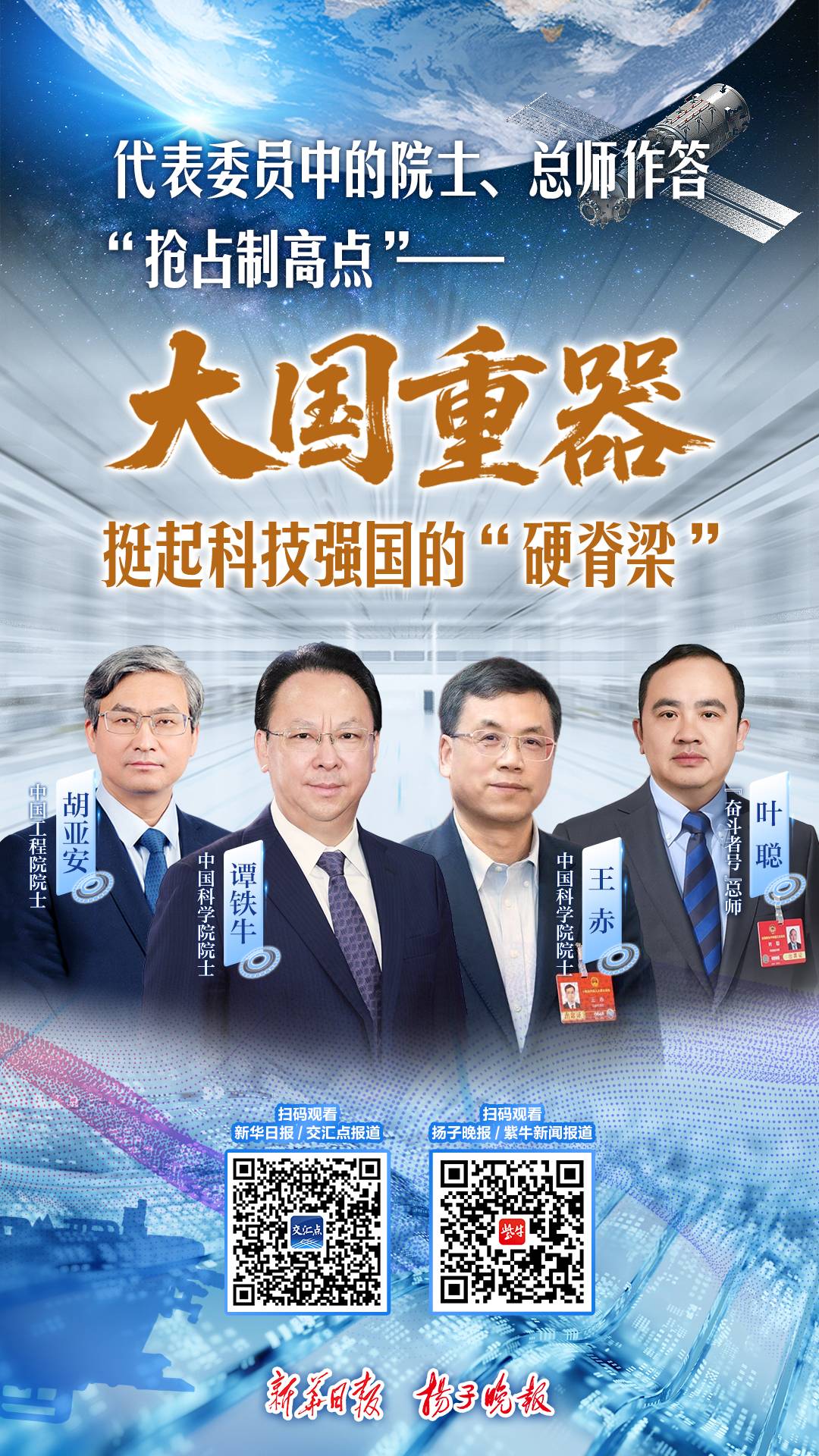 回首“十四五”,“天问”追星、“羲和”逐日、“白鹤”亮翅、“奋斗者”号深潜……一件件大国重器挺起民族脊梁,标定中国科技新高度,成为国家综合实力的重要标志。而在这些国之重器的背后,处处闪耀着江苏智慧、江苏原创、江苏担当。今年全国两会期间,新华日报、扬子晚报联合推出“院士、总师说大国重器”重磅策划,邀请江苏代表团及住苏全国政协委员中的院士、总师介绍大国重器背后的硬核创新密码与时代使命担当,立足 “十五五”新起点,共话科技自立自强的新突破、新作为。