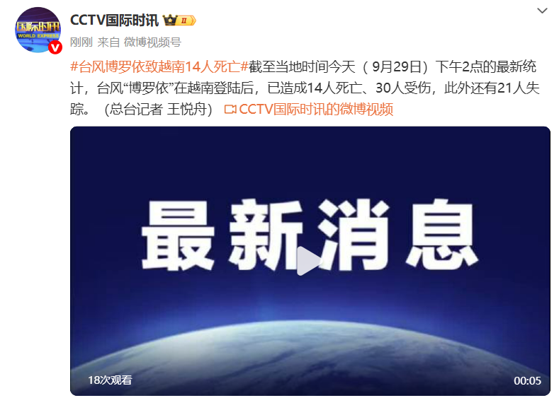 据CCTV国际时讯,截至当地时间今天(9月29日)下午2点的最新统计,台风“博罗依”在越南登陆后,已造成14人死亡、30人受伤,此外还有21人失踪。