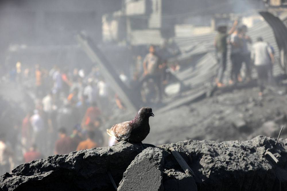 2023年10月26日,在加沙地带南部城市汗尤尼斯,一只鸽子停留在以军袭击后留下的建筑废墟上。新华社发(亚西尔·库迪摄)