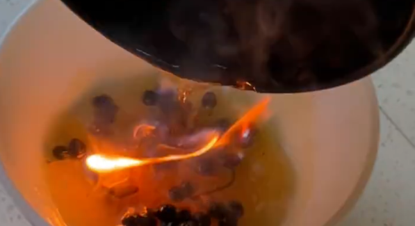 女子在家做花椒油时,将热油倒入一个较薄的陶瓷碗中,碗无法承受瞬间的高温与冲击,当场破裂。图源:中国消防