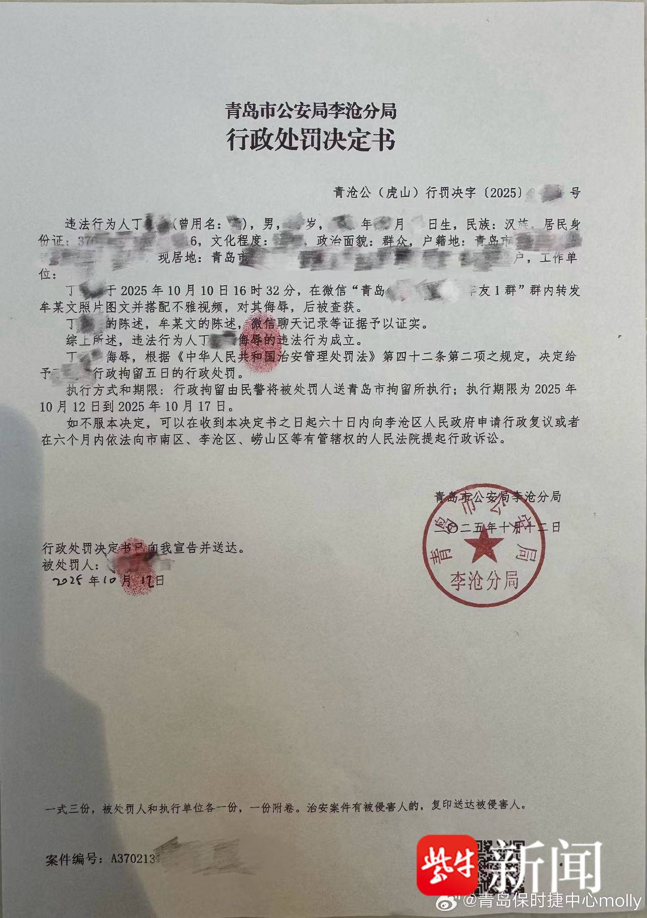行政处罚决定书显示,一男子于10月10日16时32分,在微信群内转发牟某文照片图文并搭配不雅视频,对其侮辱,后被查获。根据《中华人民共和国治安管理处罚法》第四十二条第二项之规定,决定给予该男子行政拘留五日的行政处罚。