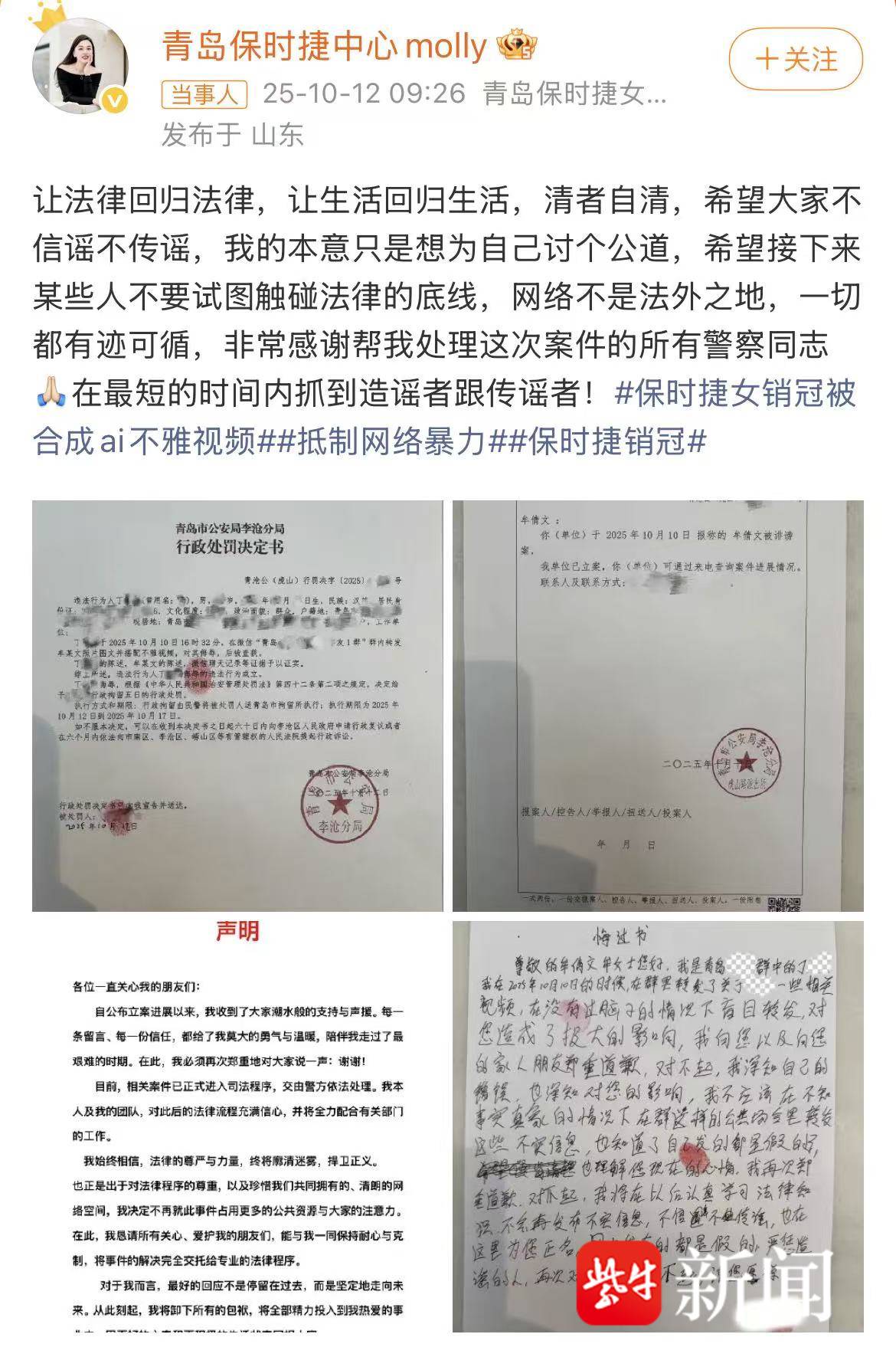 近日,“青岛保时捷女销冠牟倩文发文称被合成AI不雅视频”一事引发关注。10月12日上午,牟倩文在社交平台再发文,并附上青岛市公安局李沧分局行政处罚决定书。行政处罚决定书显示,一名男子因传播相关图片视频、对其进行侮辱,被警方处以行政拘留。