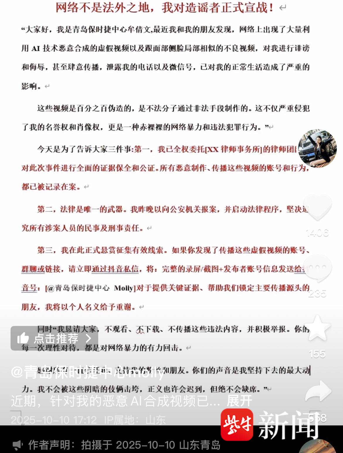牟倩文表示,这些视频是百分之百伪造的,是不法分子通过非法手段制作的。她已委托律师团队进行证据保全和公证,并前往公安机关报案,同时悬赏征集有效线索。她也呼吁公众:“不观看、不下载、不传播这些违法内容,并积极举报。”