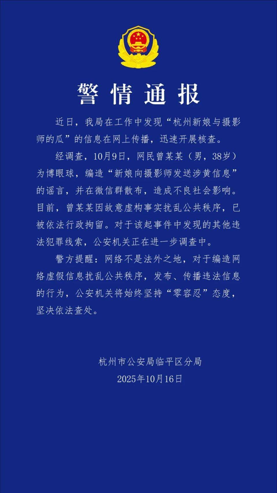 杭州市公安局临平区分局10月16日发布警情通报:近日,我局在工作中发现“杭州新娘与摄影师的瓜”的信息在网上传播,迅速开展核查。经调查,10月9日,网民曾某某(男,38岁)为博眼球,编造“新娘向摄影师发送涉黄信息”的谣言,并在微信群散布,造成不良社会影响。目前,曾某某因故意虛构事实扰乱公共秩序,已被依法行政拘留。对于该起事件中发现的其他违法犯罪线索,公安机关正在进一步调查中。