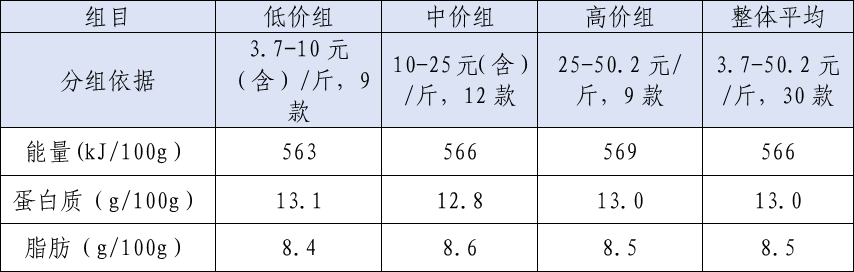 不同价组鸡蛋能量、蛋白质、脂肪平均含量