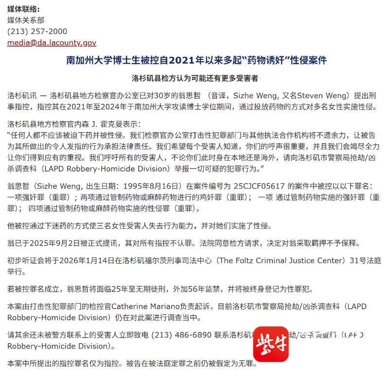 10月15日,洛杉矶县地方检察官办公室用中英文双语发布通报,表示翁某喆出生于1995年8月16日,他“被控通过下迷药的方式使三名女性受害人失去行为能力,并对她们实施了性侵。”