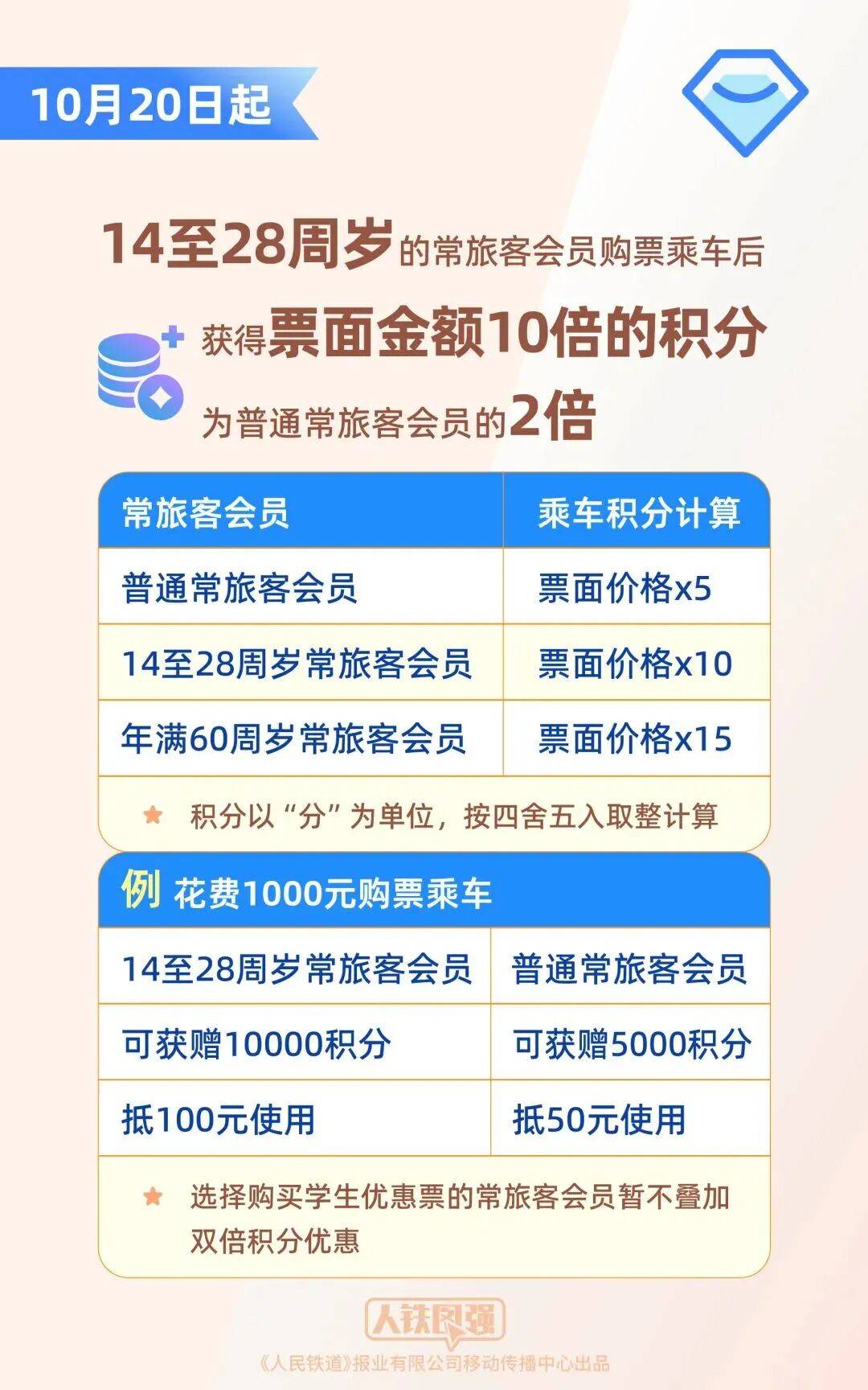 此次“铁路畅行”常旅客会员服务优化升级,是国铁集团贯彻落实党中央、国务院提振消费专项行动方案,进一步扩大以铁路为纽带的服务消费,更好满足旅客对美好旅行生活向往的具体措施。目前,普通常旅客会员购票乘车后可获得票面金额5倍的积分,年满60周岁的老年常旅客会员可获得票面金额15倍的积分,为普通常旅客会员的三倍。10月20日起,14至28周岁的常旅客会员购票乘车后将获得票面金额10倍的积分,为普通常旅客会员的两倍,即普通常旅客会员花费1000元购票乘车,可获赠5000积分、抵50元使用;14至28周岁的常旅客会员花费1000元购票乘车可获赠10000积分、抵100元使用。选择购买学生优惠票的常旅客会员暂不叠加双倍积分优惠。