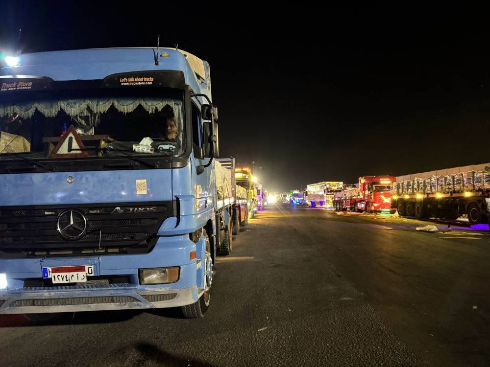 这是10月12日在拉法口岸埃及一侧拍摄的等待进入加沙的载有人道主义援助物资的卡车。新华社发(阿里·穆斯塔法摄)