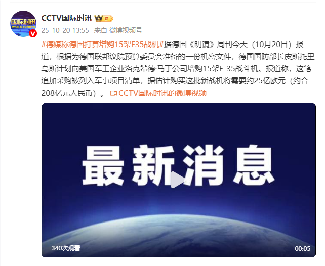 据德国《明镜》周刊今天(10月20日)报道,根据为德国联邦议院预算委员会准备的一份机密文件,德国国防部长皮斯托里乌斯计划向美国军工企业洛克希德·马丁公司增购15架F-35战斗机。报道称,这笔追加采购被列入军事项目清单,据估计购买这批新战机将需要约25亿欧元(约合208亿元人民币)。