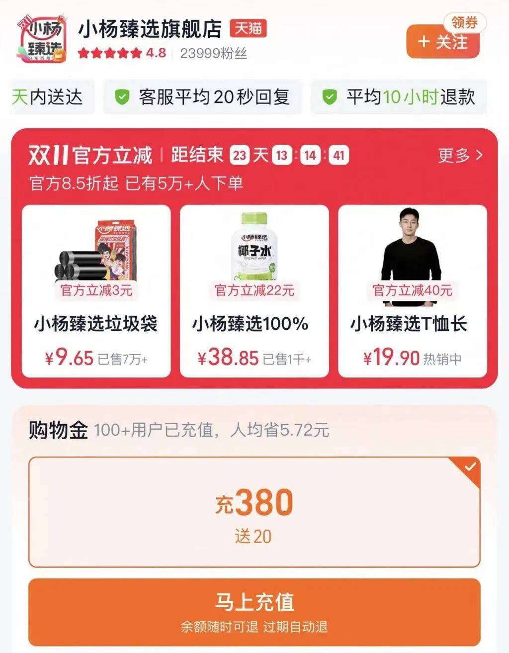 而在天猫平台的小杨臻选旗舰店首页,虽然店铺打出了“双十一”活动标识,并展示了小杨哥和相关产品的海报,页面核心位置还展示了“充380送20”的购物金活动,但参与人数并不多,显示“100+用户已充值”。