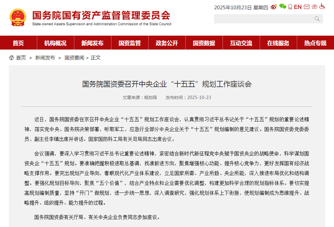 国务院国资委召开中央企业“十五五”规划工作座谈会