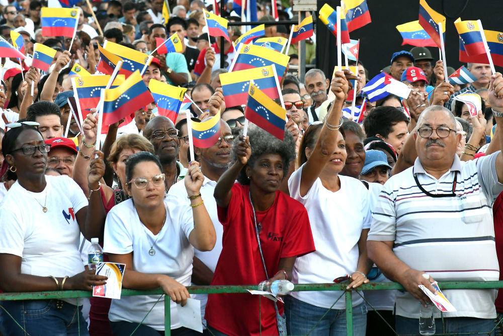 10月17日,在古巴首都哈瓦那,古巴民众挥舞旗帜参加集会,抗议美国军事威胁委内瑞拉,表达对委内瑞拉人民和政府的坚定支持。新华社发(华金·埃尔南德斯摄)