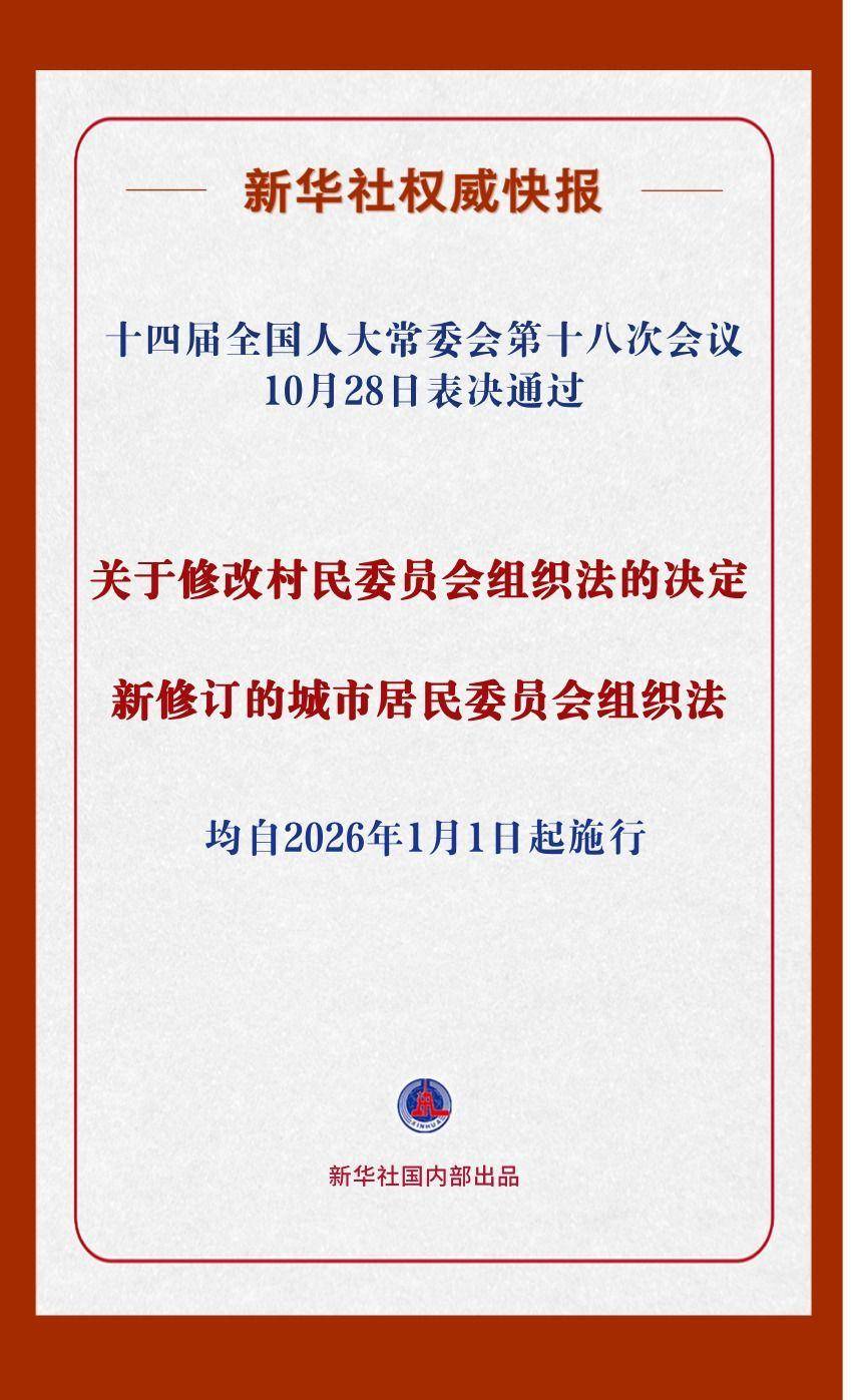 10月28日,十四届全国人大常委会第十八次会议分别表决通过关于修改村民委员会组织法的决定和新修订的城市居民委员会组织法,均自2026年1月1日起施行。