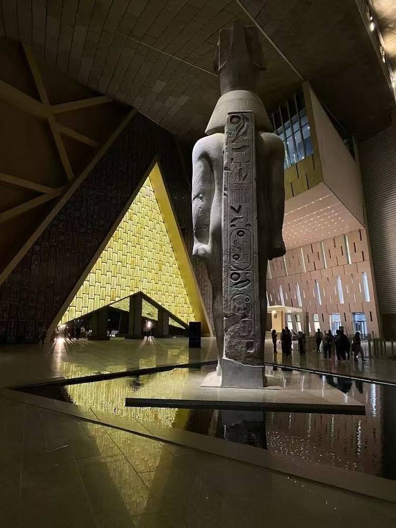 大埃及博物馆的建筑光滑如楔、外形锐利,石灰岩外立面上覆盖着互相嵌套的金字塔形图案,颇有几分机场或购物中心的模样,在棕榈树的掩映下,穿着制服的博物馆工作人员精神十足,高尔夫球车载着游客穿梭其间。