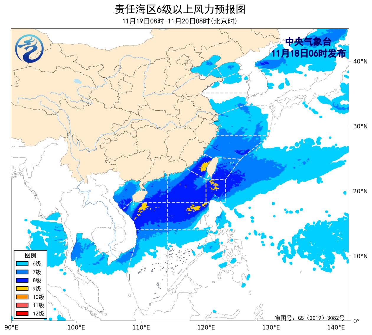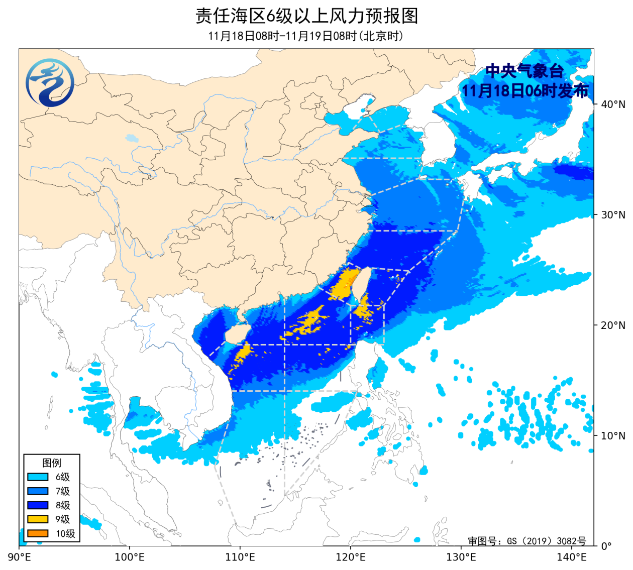 11月17日14时至18日02时,渤海、黄海南部海域、东海大部海域、台湾海峡、台湾以东洋面、南海东北部海域出现了6~8级、阵风9级的偏北风或东北风,渤海海峡、黄海北部和中部海域、巴士海峡、南海西北部海域、北部湾、南海中西部海域、南海西南部海域出现了5~6级、阵风7级的偏北风或东北风。