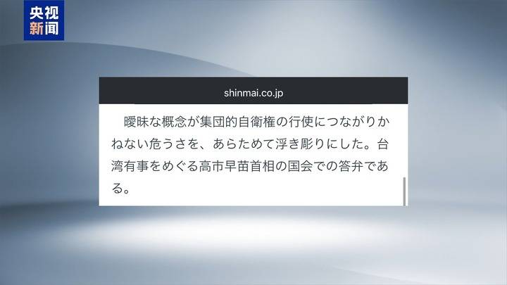 日本《信浓每日新闻》发文称,高市早苗首相在国会就“台湾有事”所作的答辩再次凸显出模棱两可的相关定义可能导致行使集体自卫权一事的危险性。