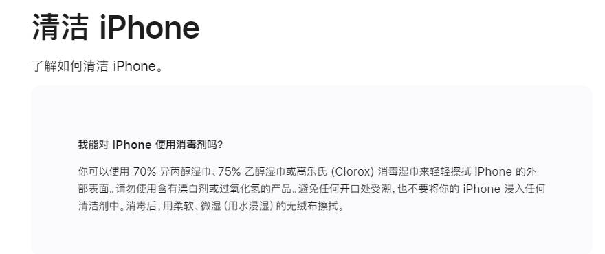 同时,记者在部分社交媒体平台对有关关键词进行了搜索,暂未发现其他用户反映类似情况。据苹果官网对“如何清洁iPhone”的介绍,可以使用70%异丙醇湿巾、75%乙醇湿巾或高乐氏(Clorox)消毒湿巾来轻轻擦拭iPhone的外部表面。“请勿使用含有漂白剂或过氧化氢的产品。避免任何开口处受潮,也不要将iPhone浸入任何清洁剂中。消毒后,用柔软、微湿(用水浸湿)的无绒布擦拭。”