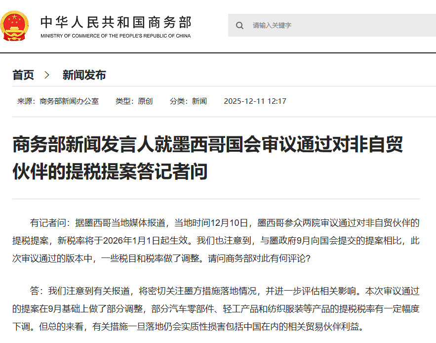 有记者问:据墨西哥当地媒体报道,当地时间12月10日,墨西哥参众两院审议通过对非自贸伙伴的提税提案,新税率将于2026年1月1日起生效。我们也注意到,与墨政府9月向国会提交的提案相比,此次审议通过的版本中,一些税目和税率做了调整。请问商务部对此有何评论?
