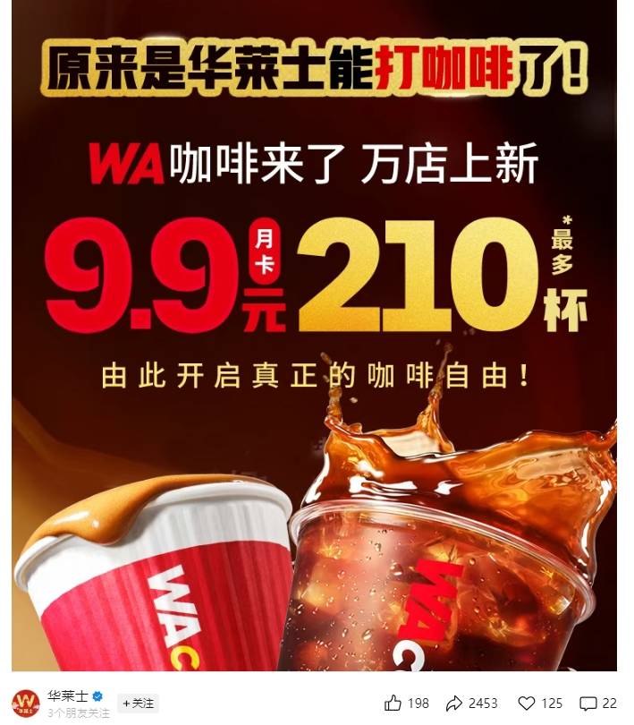 “9.9元就能包月喝咖啡,你见过吗?”近日,快餐品牌华莱士推出的咖啡月卡在社交媒体走红,在咖啡品牌纷纷收缩9.9元低价产品的情况下,这一“白菜价”权益产品迅速引发网友广泛关注与讨论。