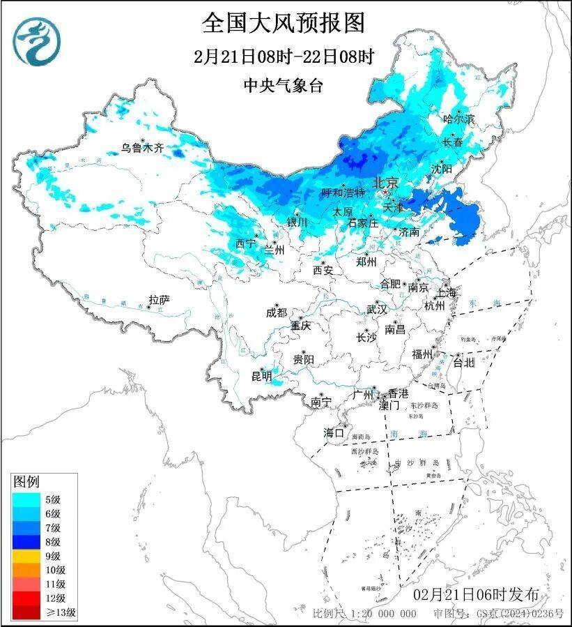 中央气象台2月21日6时继续发布大风黄色预警。新疆北疆东部、内蒙古大部、甘肃河西、宁夏中北部、青海东部、陕西北部、华北大部、东北地区中西部、辽东半岛、山东半岛等地的部分地区有5至7级风,阵风8至10级,局地风力可达11级以上。