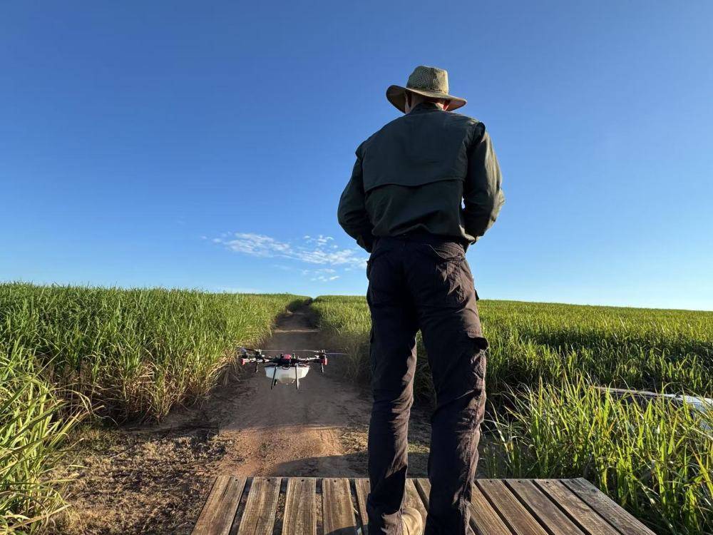 2025年3月25日,在南非夸祖鲁-纳塔尔省的方廷希尔庄园,飞手操纵无人机为甘蔗林喷洒药剂。新华社记者白舸摄