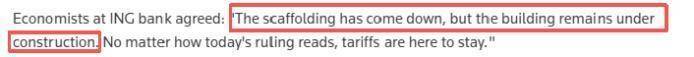 文章援引欧洲政策中心(European Policy Centre )分析师瓦格·福克曼的话说:“这只会开启全球贸易新的高度不确定期,最终局面很可能换汤不换药。”荷兰国际集团(ING)经济学家也认为:“‘脚手架虽已拆除,但建筑仍在施工’。无论判决如何,关税政策不会消失。”