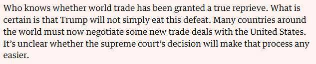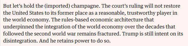 英国《卫报》2月21日刊载的评论文章说,这一裁决令人耳目一新。但别急着开香槟庆祝——这份裁决既无法让美国重拾“可信赖经济体”的声誉,也难以修复二战后建立的多边贸易体系。
