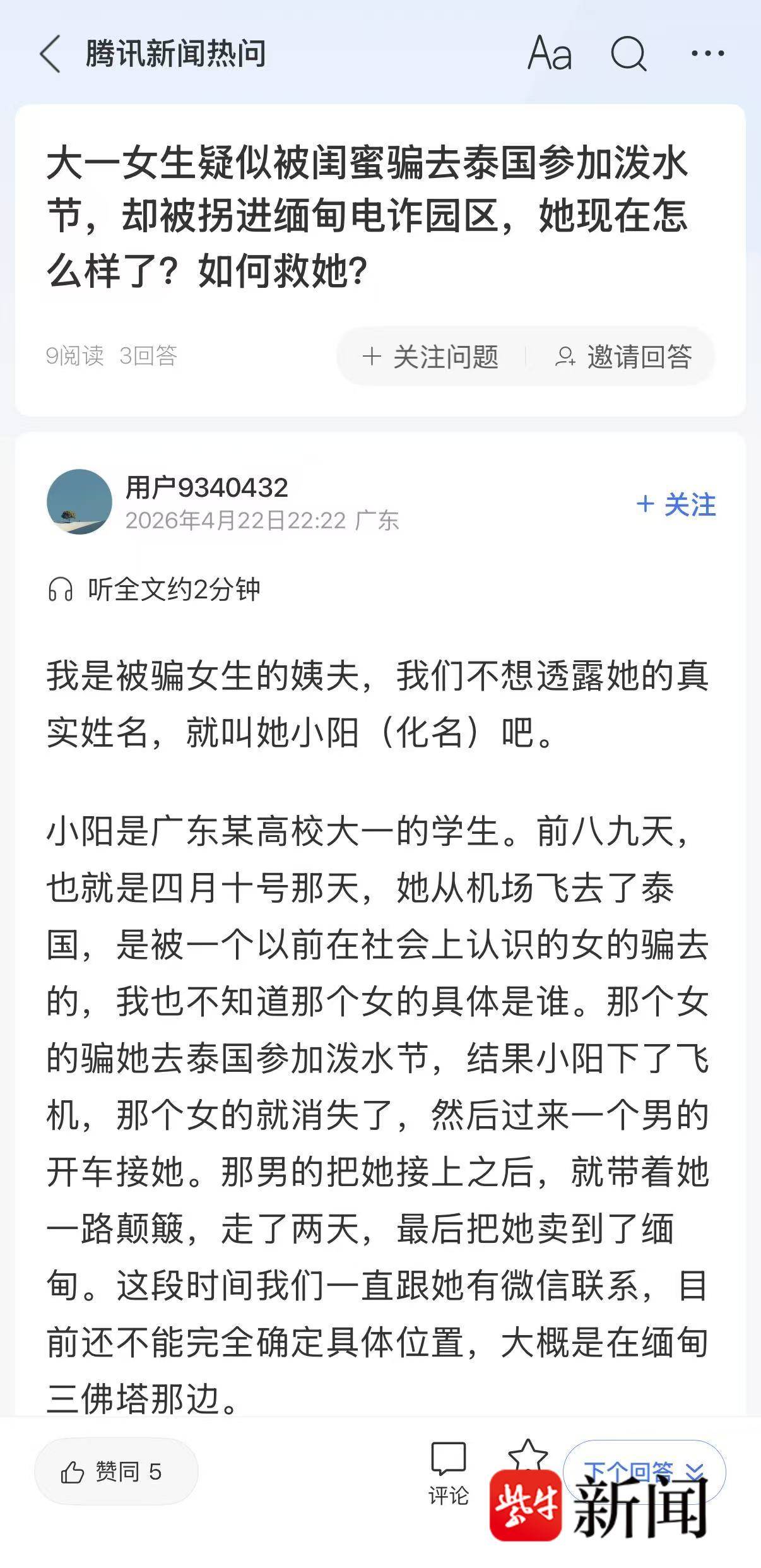 广东某高校一名女大学生近日受邀前往泰国参加泼水节,下飞机后随即被控制并转卖至缅甸电诈园区。其家人为营救已支付20万元赎金,却遭对方一再拖延,目前警方已立案调查,家人心急如焚,在腾讯热问发帖求助。