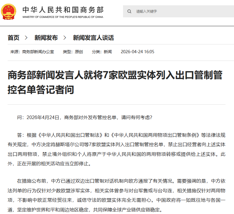 问:2026年4月24日,商务部对外发布管控名单,请问有何考虑?