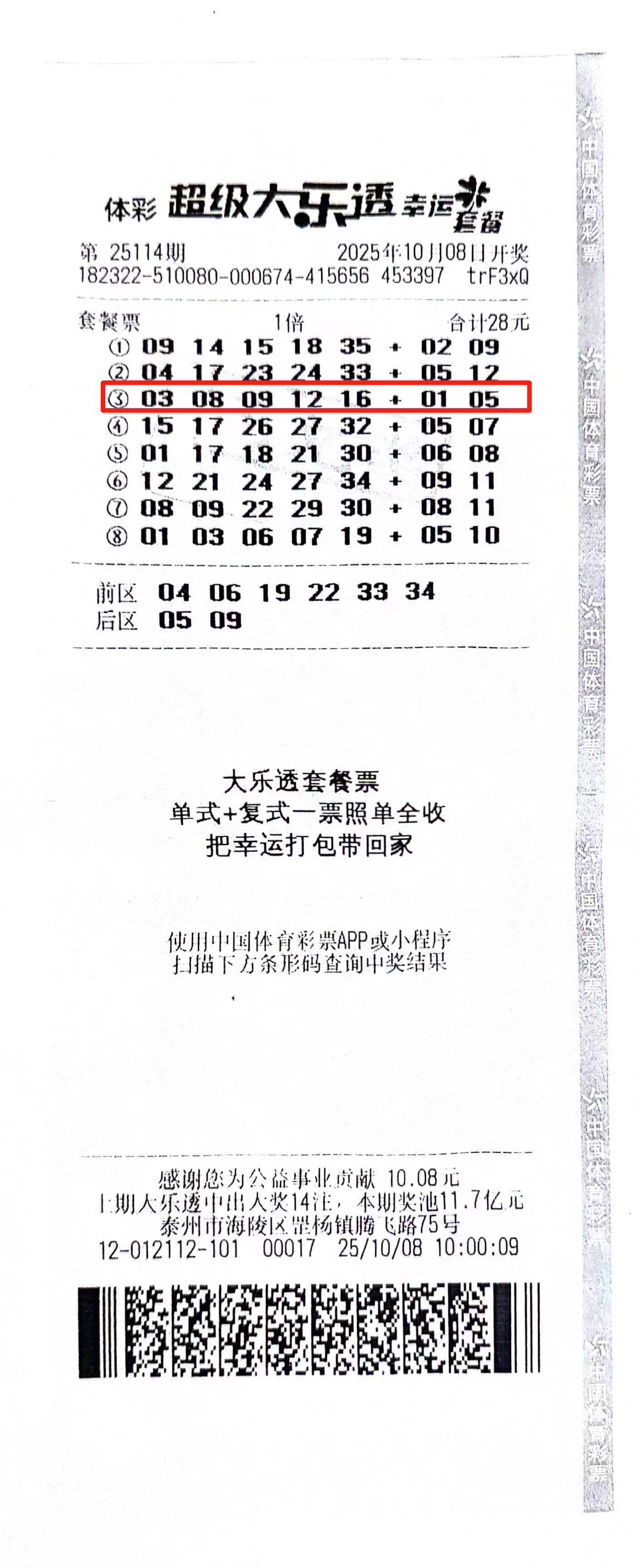 体彩大乐透幸运套餐票,不用费心搭配号码,轻松覆盖多样组合,让购彩少点纠结、多点期待,随手一张就有机会邂逅幸运。近日,来自泰州3212012112网点的购彩者张先生现身江苏省体彩中心兑奖大厅,凭借一张28元幸运套餐票领走了体彩大乐透第25114期1注基本投注一等奖,将826万元奖金收入囊中。