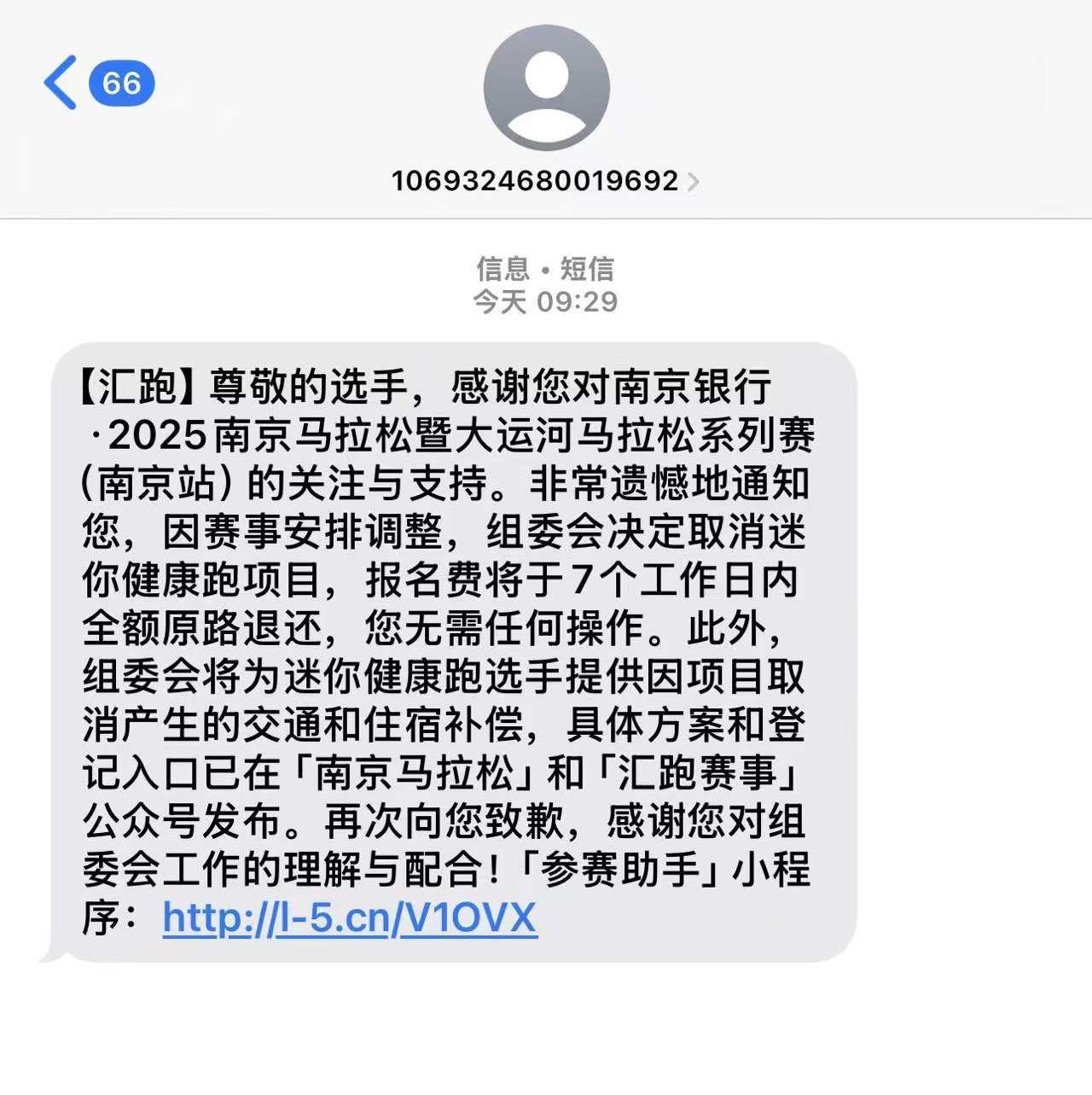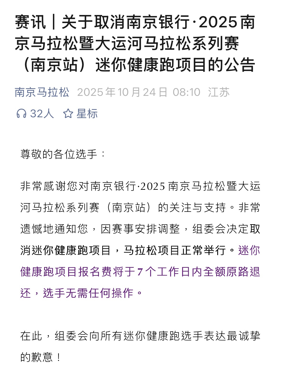 10月24日,南京马拉松组委会通过官方渠道发布公告称,因赛事安排调整,组委会决定取消迷你健康跑项目,马拉松项目正常举行,已报名健康跑的选手将获全额报名费用的退费。同时,组委会将做好善后工作,为迷你健康跑选手提供因项目取消产生的交通和住宿补偿。