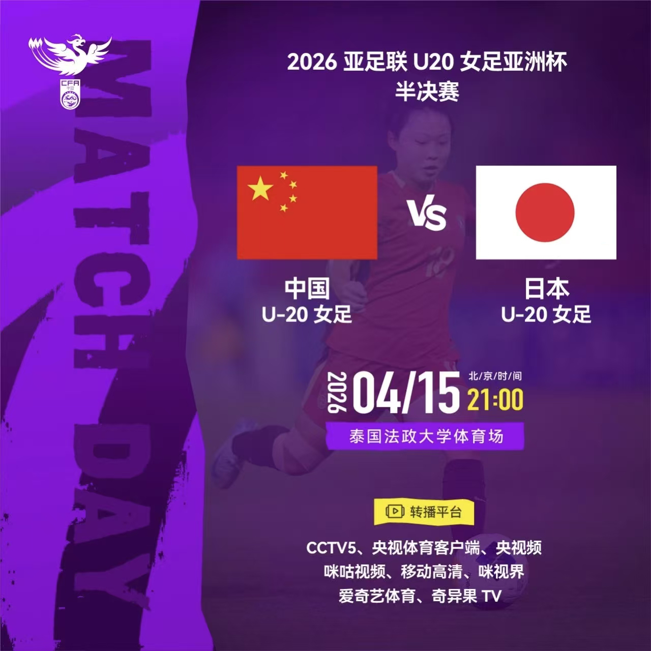 北京时间4月15日21:00,2026亚足联U20女足亚洲杯半决赛焦点战即将在泰国法政大学体育场拉开帷幕。中国U20女足将迎战老对手日本U20女足。